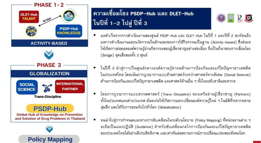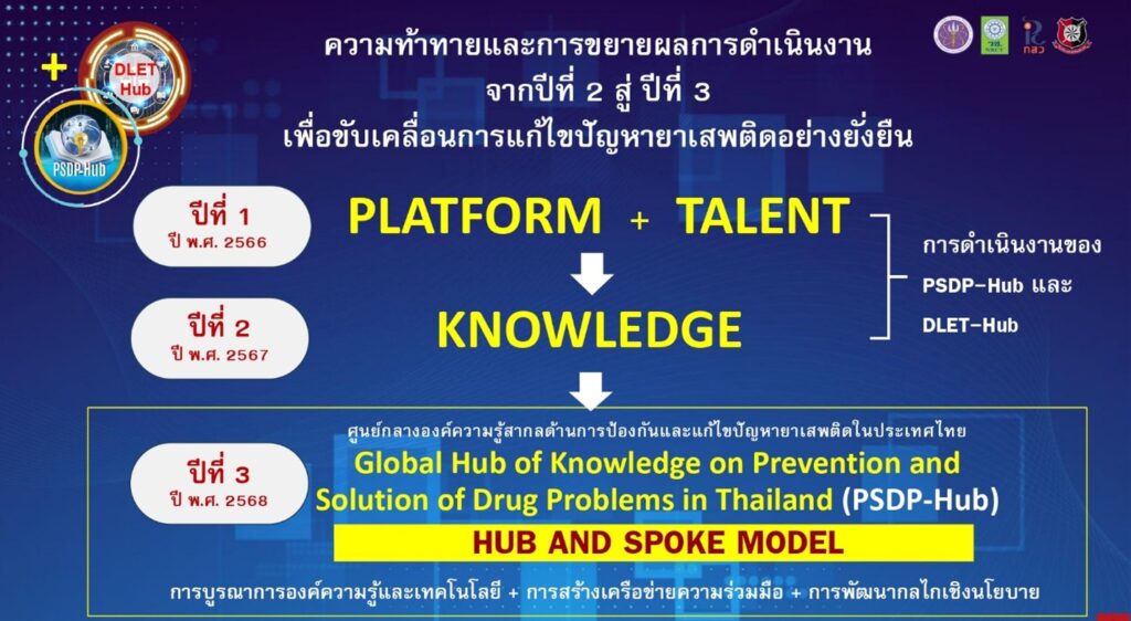 การยกระดับจาก ศูนย์ PSDP-Hub มาเป็นศูนย์กลางองค์ความรู้สากลด้านการป้องกันและแก้ไขปัญหายาเสพติดใปประเทศไทย จึงมีเป้าหมายสุดท้ายในการพัฒนาพัฒนาศักยภาพการกำกับดูแลและกำหนดทิศทางการขับเคลื่อนการดำเนินงานให้เกิดความยั่งยืน เพื่อให้เกิดการรวบรวมองค์ความรู้ใหม่ ๆ ที่มีความเป็นปัจจุบัน ทันต่อสถานการณ์การเปลี่ยนแปลงของโลกอันจะนำไปสู่การเป็นองค์กรต้นแบบของประเทศซึ่งมีฐานข้อมูล (Database) ที่รวบรวมคลังความรู้ด้านการป้องกันและแก้ไขปัญหายาเสพติดที่มีความหลากหลายทั้งในระดับประเทศและระดับสากล โดยการดำเนินกิจกรรมในระยะนี้จะเป็นการต่อยอดสู่การปฏิบัติงานในเชิงพื้นที่ (Area-based of Knowledge) ผ่านแพลตฟอร์ม PSDP-Hub ซึ่งเป็นการพลิกโฉมแนวทางการดำเนินงานแบบเชิงรุกและมุ่งหวังผลลัพธ์ในรูปแบบ Quick win ในการจัดการปัญหายาเสพติด ด้วยการส่งเสริมให้ประชาชนในชุมชนมีส่วนร่วมในการตัดสินใจผ่านการสร้างความรู้ การพัฒนาแนวทาง และการจัดทำแนวปฏิบัติร่วมกัน โดยการมีส่วนร่วมดังกล่าวจะช่วยให้เกิดการจัดการปัญหายาเสพติดแบบครบวงจร ทั้งในด้านการช่วยเหลือ การป้องกัน และการแก้ไข พร้อมทั้งตัดวงจรการกระทำผิดซ้ำอย่างเป็นระบบ โดยมีกลไกและแนวทางการสร้างความยั่งยืนของศูนย์ PSDP-Hub